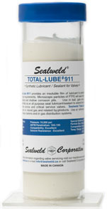 Sealweld Total-Lube #911 provides an insoluble film of lubricant to protect seal faces and reduce torque requirements. Microscopic particles of PTFE will seal minor scratches to sealing surfaces and shallow corrosion pits. Seals scratches up to 0.010\" and nicks and cuts on soft seats. Designed specifically as an all-purpose seat lubricant/ sealant to extend the maintenance interval in severe service and critical service valves. Sealweld Total-Lube #911 is insoluble in water, oil, natural gas and related by-products. Suitable for sour service valves.