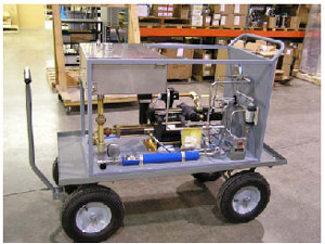 Consisting of 8SFD-40 Liquid Pump with Arctic Modification Drive Assembly, fluid reservoir with fill port , air drive regulator, air drive filter, air drive gauge, speed control valve, return to tank valve, outlet regulator capable of 3 gpm at 2,000 PSI, relief valve to be downstream of outlet regulator and to drain back to tank, hydraulic accumulator suitable for diesel fuel, isolation valve for accumulator, and outlet pressure gauge all housed in a metal cart frame with gauges panel-mounted and wheels. Parts available on request.