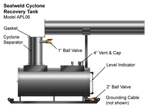 The Sealweld® Cyclone Tank comes complete, as illustrated, with all necessary piping, baffles and valves including a sight glass/level indicator.